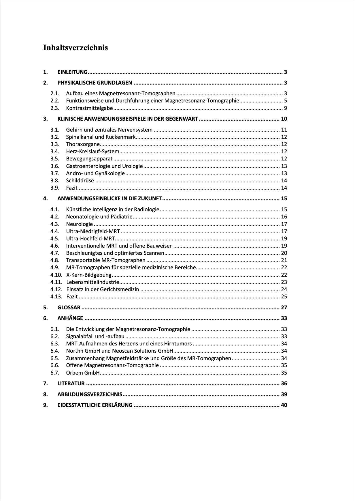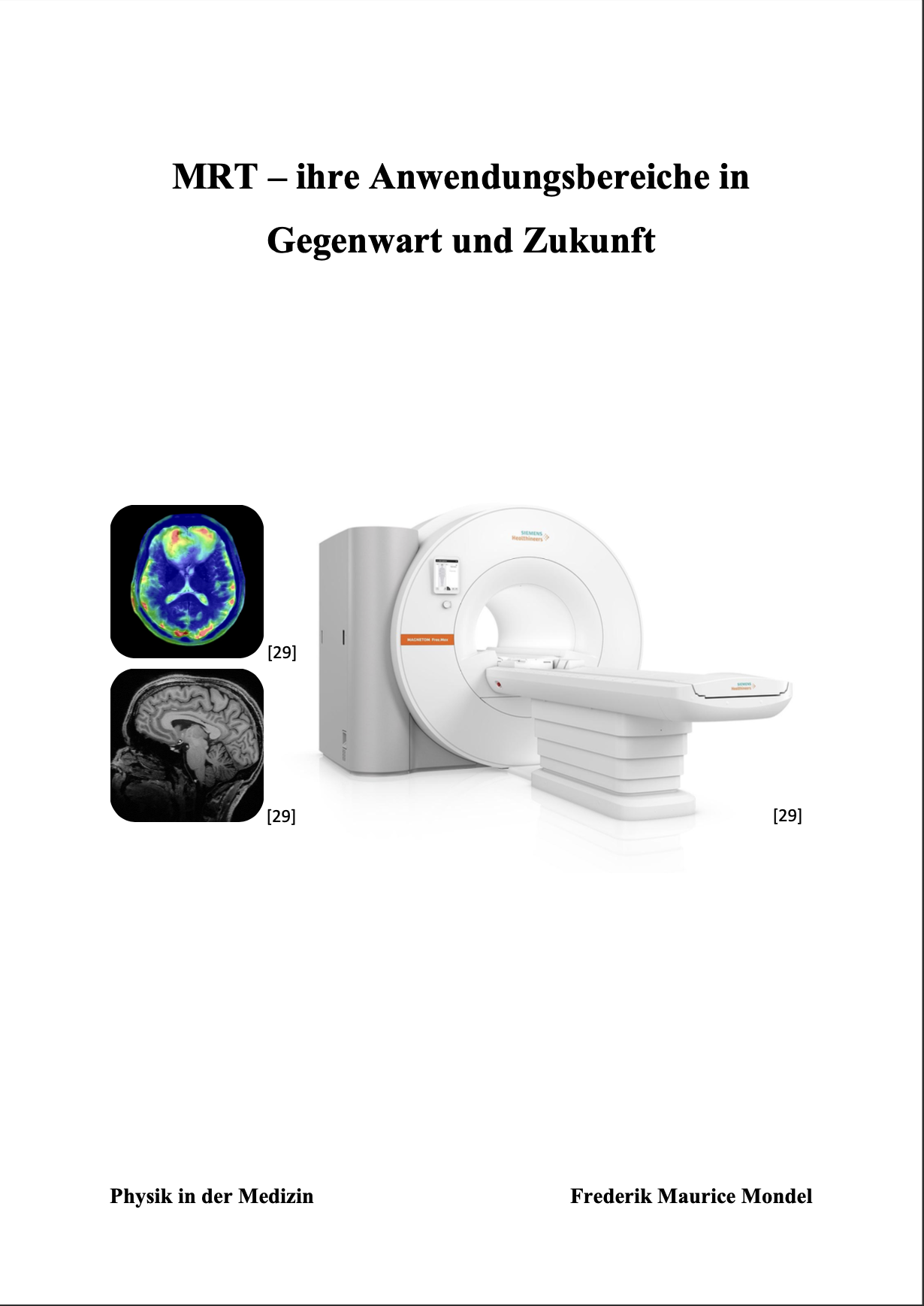The paper provides a comprehensive overview of magnetic resonance imaging (MRI), first explaining the physical principles and technical structure of an MR tomograph, then presenting the current clinical significance of MRI through numerous application examples—particularly in tumor diagnostics, neurology, cardiology, and other medical specialties—and finally offering a well-founded outlook on future developments, such as the use of artificial intelligence, new device designs (ultra-low and ultra-high field MRI, mobile and open systems), as well as application fields beyond classical medicine like neonatology, forensic medicine, and the food industry. Overall, the work demonstrates the central role of MRI as a radiation-free, versatile, and future-oriented imaging technique.